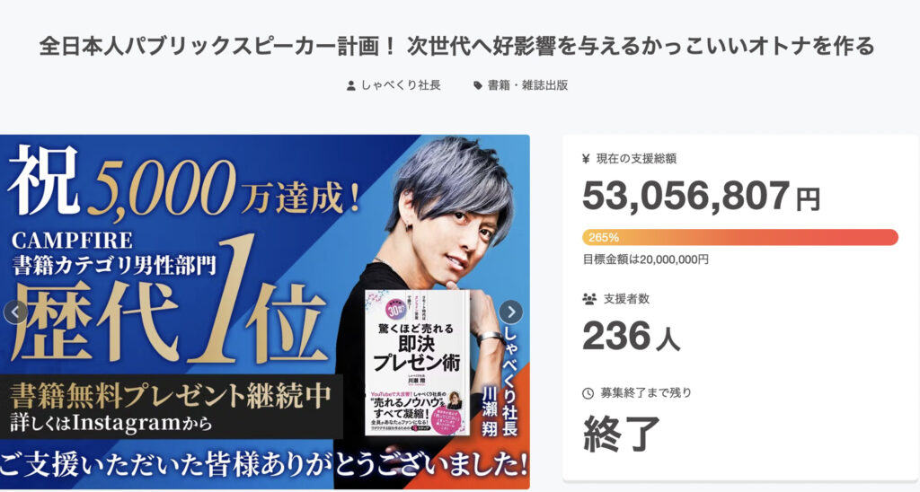 CAMPFIREにて書籍カテゴリ男性部門歴代1位を獲得
